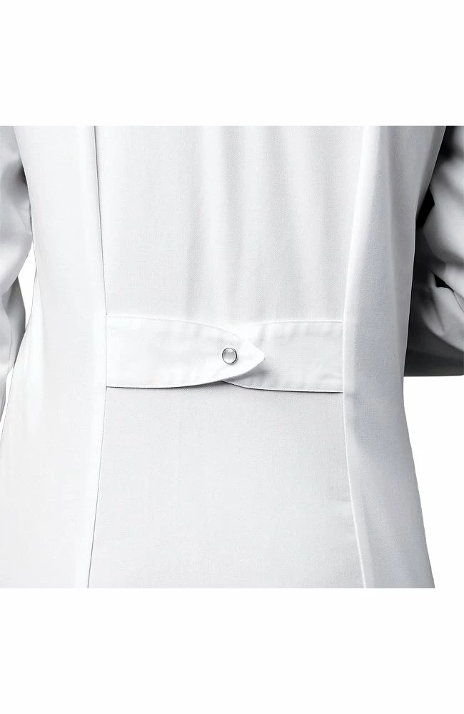 This classic notched-lapel lab coat with a snap front closure is from Professional Whites by Cherokee. Multiple pockets include 2 roomy patch pockets, a cell phone pocket and a chest pocket with a pencil stitch. It has a snap back belt detail and side vents. Princess seaming as well as front darts and a back yoke provide easy shaping.