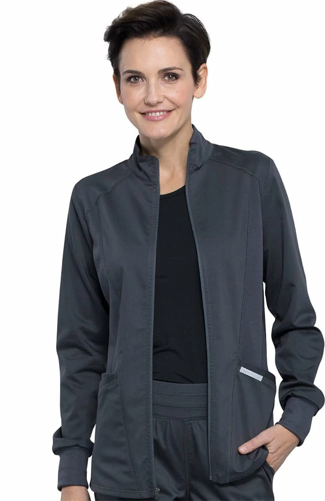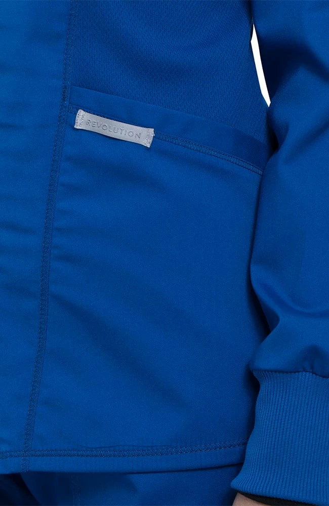 Get a sleek, sporty fit with the Revolution by Cherokee Workwear Women’s Hi-Low Solid Scrub Jacket. Enjoy an ultra stylish streamlined look that can keep up with your day. The scrub jacket features mesh panels for added breathability and a chic, stretch fit that allows for layering with other pieces.