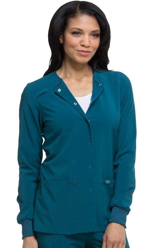 This EDS Essentials by Dickies Women’s Snap Front Warm-Up Solid Scrub Jacket is the foundation of your wardrobe. Stay cozy and keep yourself organized with pockets and loops.