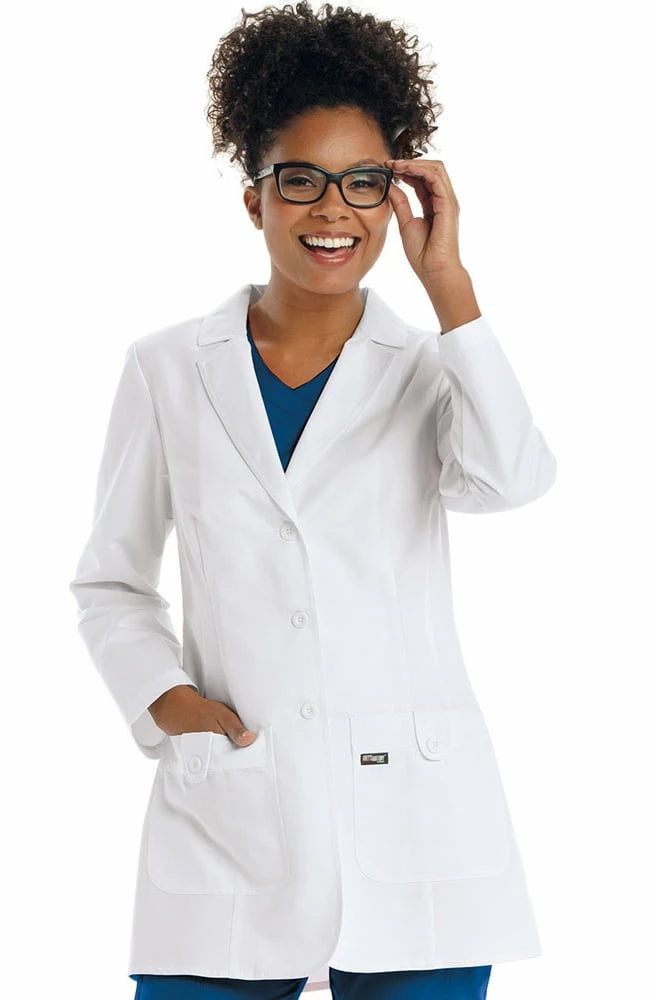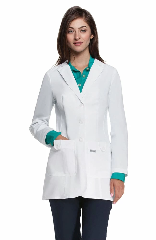 A flattering lab coat that looks crisp and clean throughout the day. Mid-thigh length coat with contoured seaming. Features a three-button closure and peaked lapels. 2 Roomy front pockets with button/tab detail and the Grey’s Anatomy Classic logo. Fabric is made up of 55% polyester, 45% cotton.