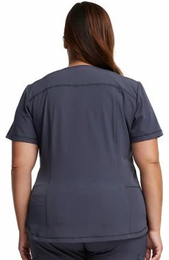 In a beautiful, lightweight, 4-way stretch fabric, this notch-neck scrub top is a delight to wear. The fashion forward styling includes a shaped neck in the top yoke (front and back), and patch pockets with angled openings and a snap tab on the left hand pocket and a pencil stitch on the right hand side. Side vents and set-in sleeves. This top has a Junior contoured fit.