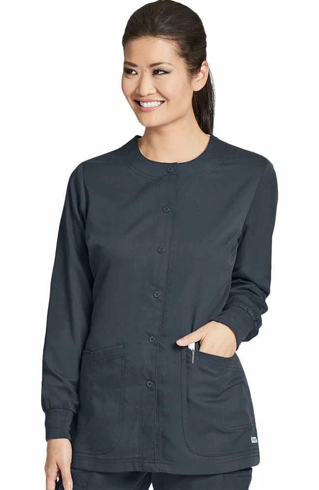 The Grey’s Anatomy Classic Women’s Round Neck Warm Up Scrub Jacket is a versatile addition to your work wardrobe. Multiple pockets make organizing easy while a back belt provides sleek shaping.
