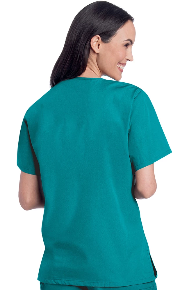 This comfortable V-neck scrub top comes from Scrub Zone by Landau. That means it’s a great value in a soft and sturdy fabric. It has short, set-in sleeves and 2 large patch pockets. Accessory tape is hidden inside the right pocket, to hold instruments safely in place. Side vents offer easy movement.