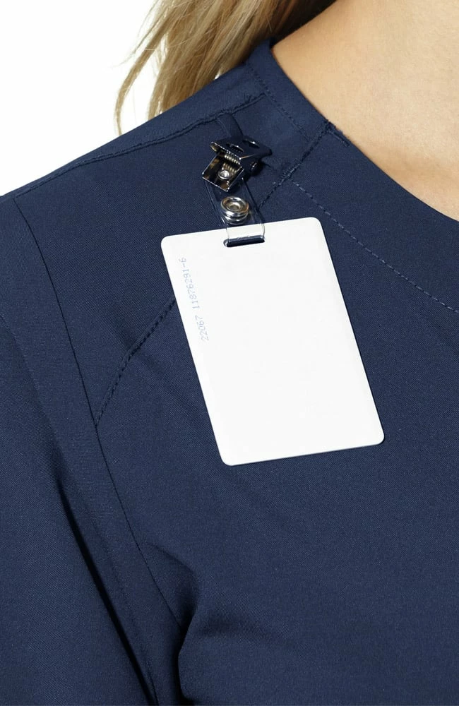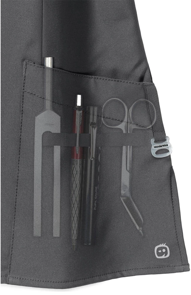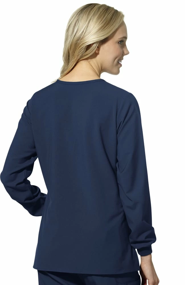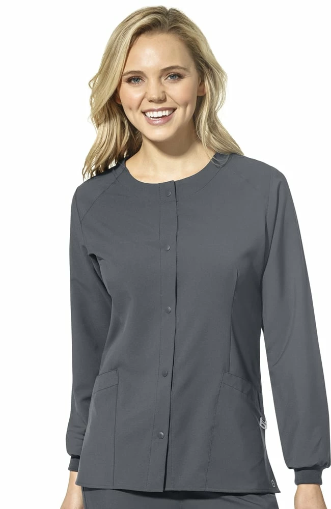 Innovative fabric and fit keeps this W123 by WonderWink Women’s Crew Neck Snap Front Solid Scrub Jacket from being your typical style. Microfiber stretch provides easy care so you always look polished without the fuss.